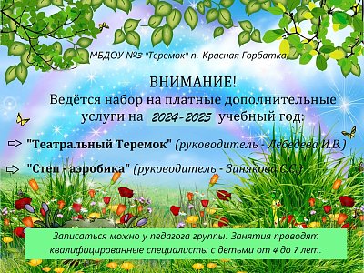 Уважаемые родители, объявляем набор в кружки для детей от 4х до 7ми лет. Предлагаем дополнительные платные образовательные услуги: